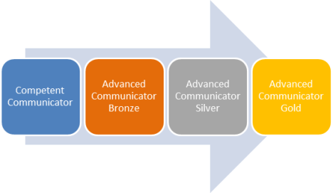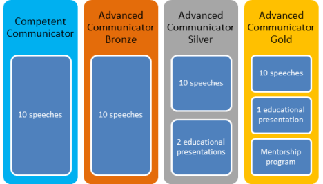 The communication program takes you through four different levels of competency, the basic level (Competent Communicator), and three advanced levels corresponding to the traditional Olympic Games levels of Bronze, Silver, and Gold (see Figure 1 below).