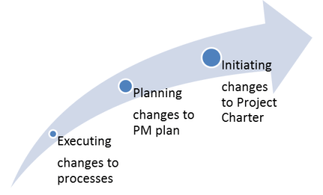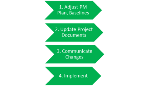 Moderate changes would involve going back into the planning process to re-calibrate the performance measurement baseline (scope, time, or cost baselin) or to update the project management plan. These would be implemented by updates to the PM plan in the Planning Process Group before the change themselves are implemented as part of the Executing Process Group.