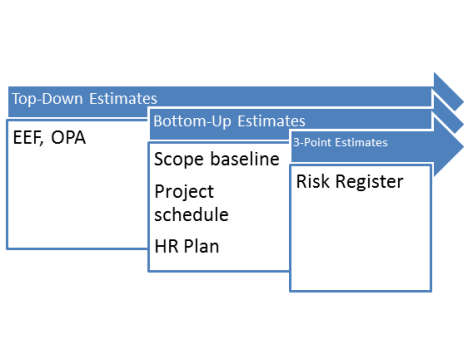 There are two basic types of estimates: top-down (analogous and parametric) based on historical data of similar projects done in the past, and bottom-up methods (e.g., 3-point estimates) based on the WBS and risk analysis. Here are some points in distinguishing the various advantages and disadvantages top-down and bottom-up methods.