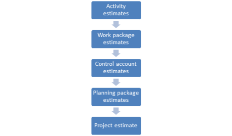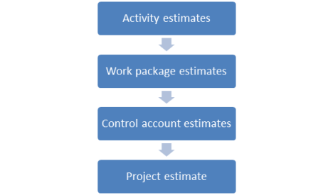 You add up all the activities to the level of the work packages, adding up all the work packages to the level of the control accounts, and then adding those up to get the final total: the project estimate, the sum of the direct costs of the project itself.