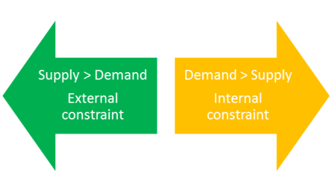 Another way to look at this is with the diagram below. In comparing supply and demand, one of them is going to be greater than the other (except if they exactly balance each other and there is therefore no constraint). Whichever one of them is smaller is the constraint. If the constraint is the demand, that comes from the market, so it is external, and if the constraint is the supply, that comes from the organization, so it is internal.